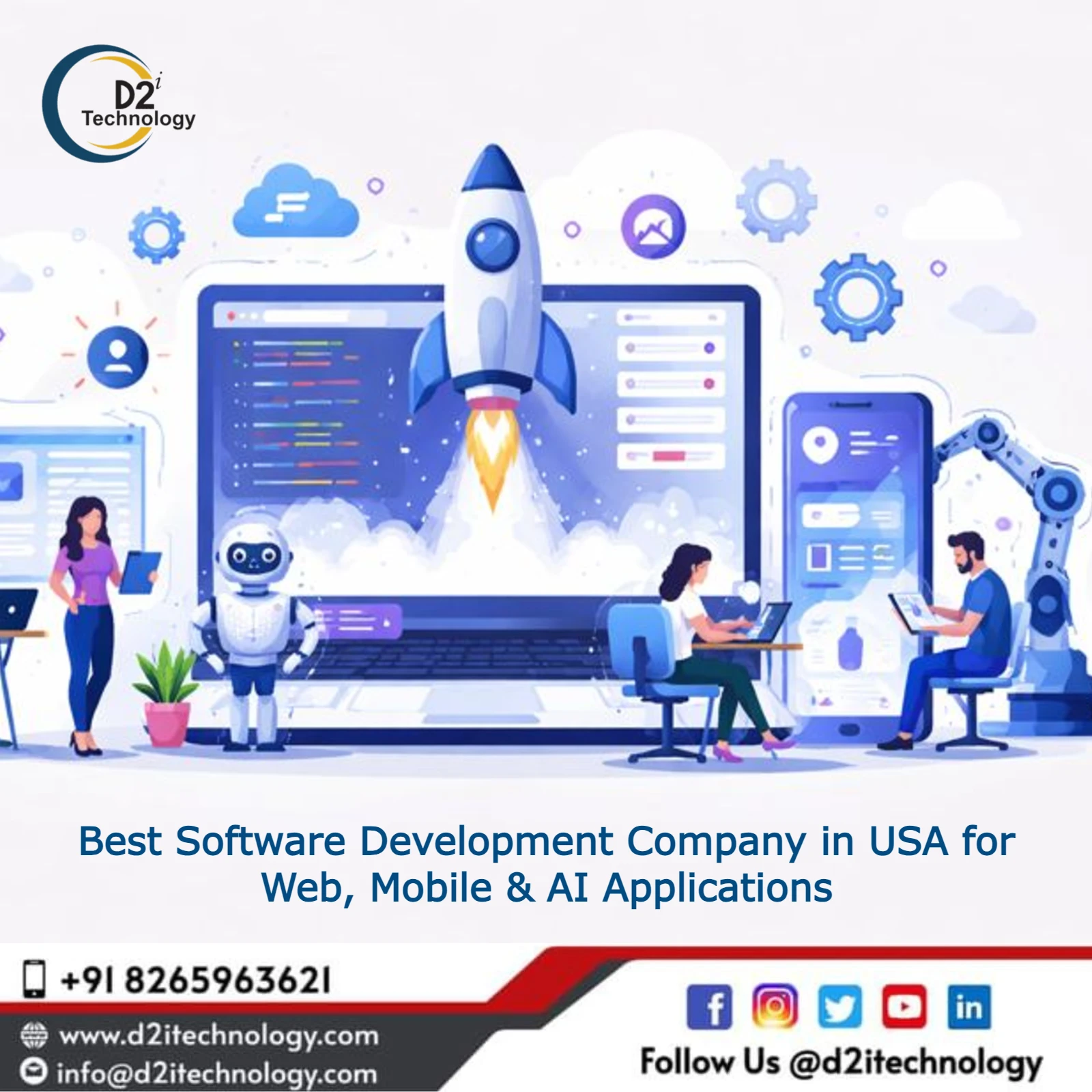 D2i Technology is a premier Software Development Company In Usa delivering custom web applications, mobile solutions, and AI-powered systems for businesses across industries. Our experienced team combines technical excellence with business focus, creating software that solves real problems and drives measurable results. We specialize in modern web development using React, Angular, Vue.js, and full-stack JavaScript; native and cross-platform mobile applications for iOS and Android; AI and machine learning integration for intelligent applications; cloud-native architecture on AWS, Azure, and Google Cloud; and API development and system integration. Our clients span financial services, healthcare, e-commerce, SaaS, and enterprise sectors, ranging from innovative startups to established corporations. We deliver projects using agile methodology with transparent communication, comprehensive testing, and ongoing support. Our commitment extends beyond project delivery—we partner with clients for long-term success, providing strategic technology guidance, ongoing maintenance, and scaling support as businesses grow.